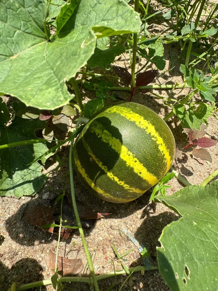 In the golden sunshine, a wealthy, stout snoot Dressed up in a vibrant pinstriped suit Under a leaf parasol, green and cute Pompous Mr Melon had a striking photoshoot